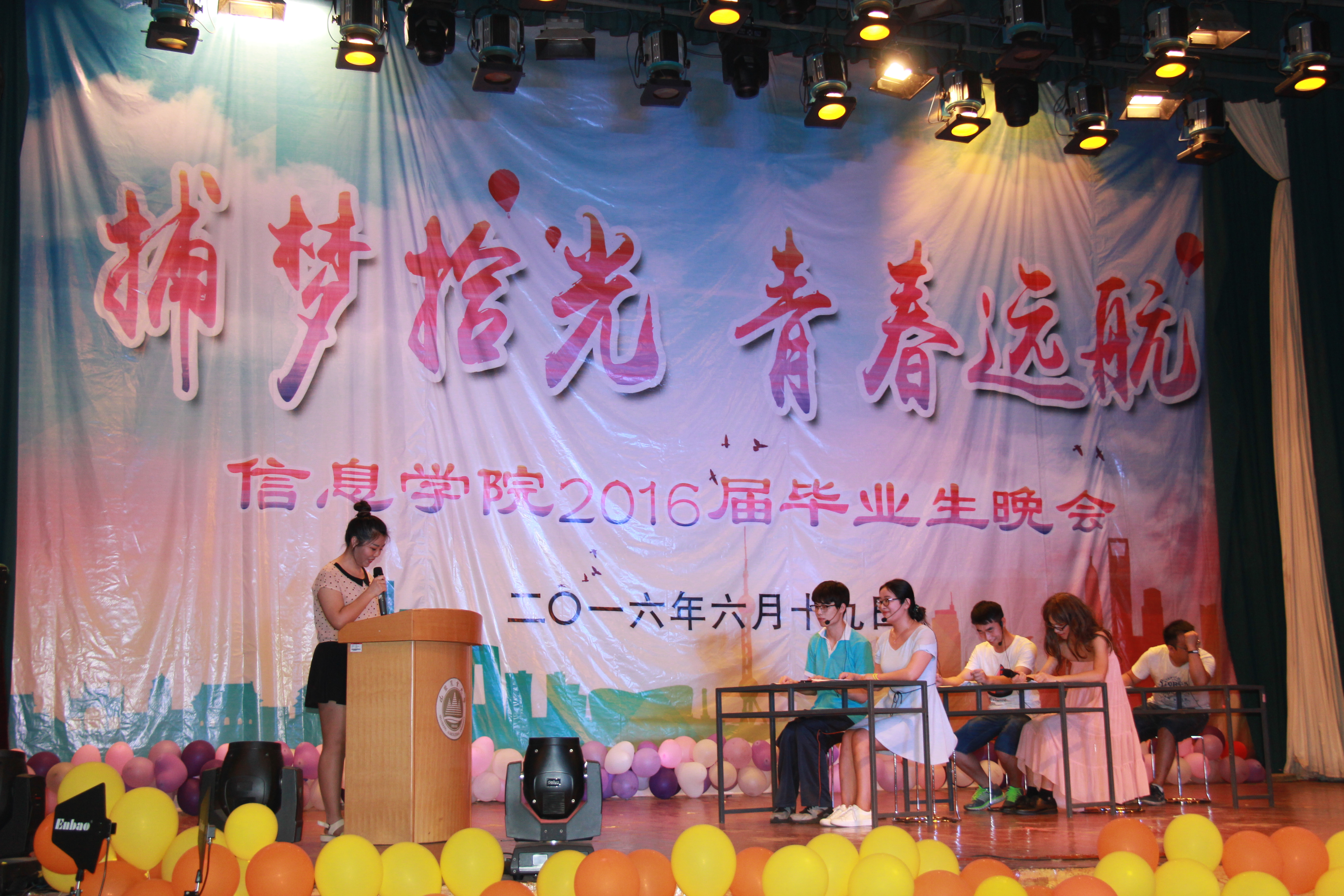 6月19日,信息学院于北校区西礼堂举办“捕梦拾光,青春远航”2016届毕业生晚会。副校长吴衍涛、学校相关部门领导及信息学院各位老师与2016届全体毕业生欢聚一堂,品茗青春。