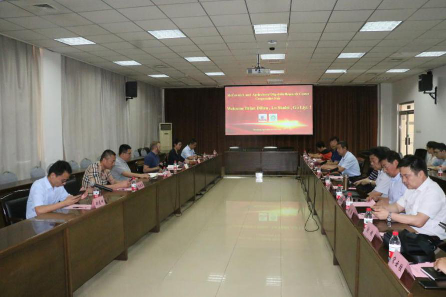 洽谈交流会由信息学院院长李西灿主持,园艺学院刘世琦教授和农业大数据研究中心相关人员参加了洽谈会。农业大数据研究中心主任柳平增教授汇报了大蒜大数据生态系统研究成果进展情况,并就当前大蒜价格波动特征及发展趋势、大蒜产业大数据生态系统构建、大数据中心优势及大数据服务产业进行了全面介绍。Mccormick公司对农业大数据中心研究成果表现出了极大兴趣,就数据共享、合作研究及人才培养等方面进行了深入探讨,并达成初步合作意向。