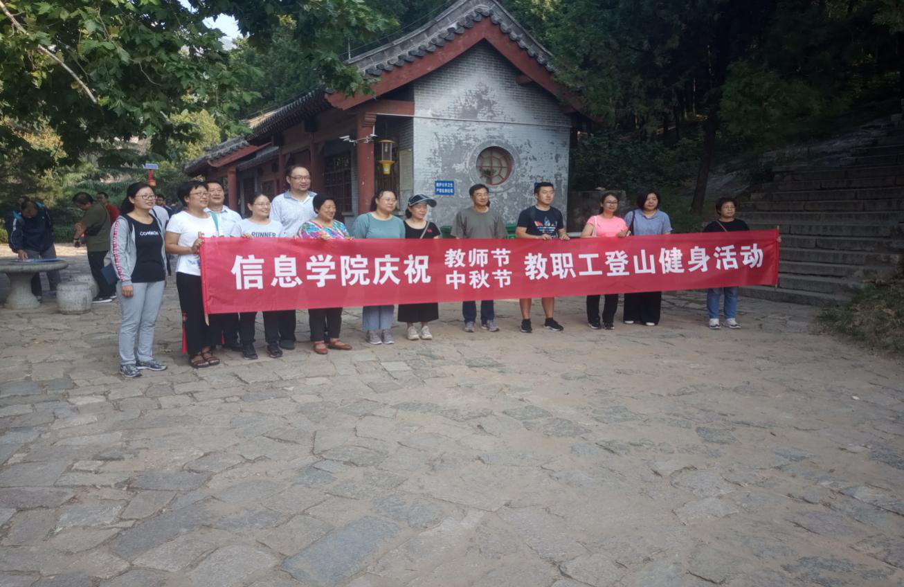 9月的泰山,秋高气爽,空气清新。7日一早,信息学院教职工心怀教师节日即将到来的喜悦,从各个校区徒步来到龙潭公园,登山健身,拍照留念,相互交流,喜气洋洋。本次登山活动,锻炼了身体,陶冶了情操,促进了教职工之间的沟通与交流,对推动和谐学院建设起到积极作用。