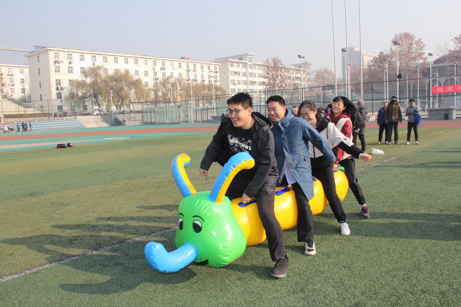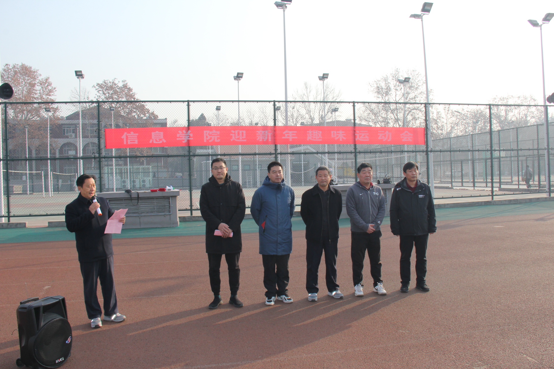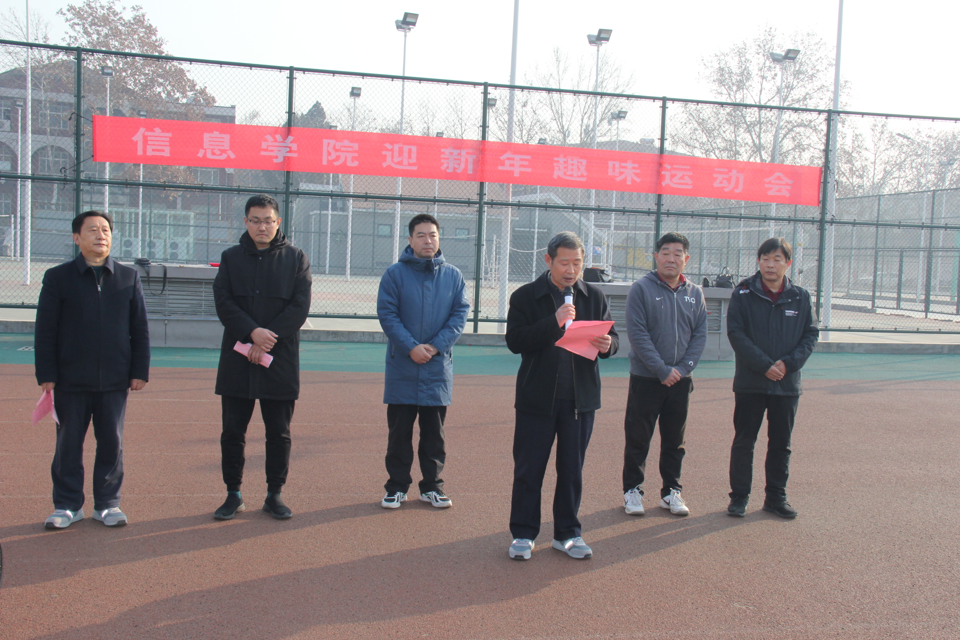 12月27日上午,信息学院在校本部西操场,举办迎新年教职工趣味运动会。学院领导、正处级组织员于学勤、全体教职工参加运动会。开幕式由学院副院长、院工会主席张洪进主持;学院工会副主席、运动会总裁判长胡晓介绍比赛项目、比赛规则。