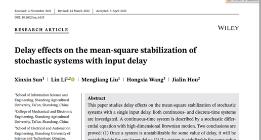近日,信息与计算科学专业本科生孙欣欣同学在控制领域SCI一区、Top期刊《International Journal of Robust and Nonlinear Control》(IF=4.41)发表题为“Delay effects on the mean-square stabilization of stochastic systems with input delay”的学术论文。论文给出了带有时滞随机系统可镇定的充要条件,解决了时滞对随机系统可镇定的影响,对研究时滞对系统稳定和镇定的影响起到了重要的指导价值。此成果的取得不仅得益于指导教师应用数学系李琳副教授的细心指导和辛勤付出,更重要的是学生在科研项目中表现出来的脚踏实地、勤于思考的学习习惯,及攻坚克难、勇于创新的精神和意识。